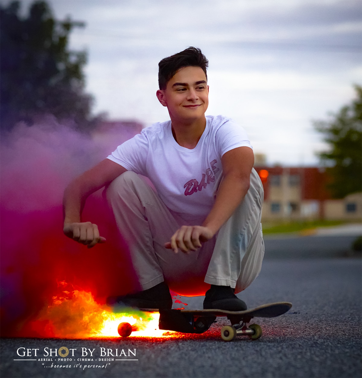 Adding Some Cool Smoke In The Background, Really Took His Images To The Next Level. After, We Headed Outside To Take What We Like To Call The “Mom Pictures” AKA The Photos That Make Mom Cry Because Her Child Is Smiling And About To Graduate From High School :). Finally, With The Last Look Of The Day, We Tried Something That Made Evan’s Photos Literally Catch On Fire. We Taped Two Smoke Bombs Under The Skateboard And… You Can Clearly See What Happens Next If You Watch The Video Below!